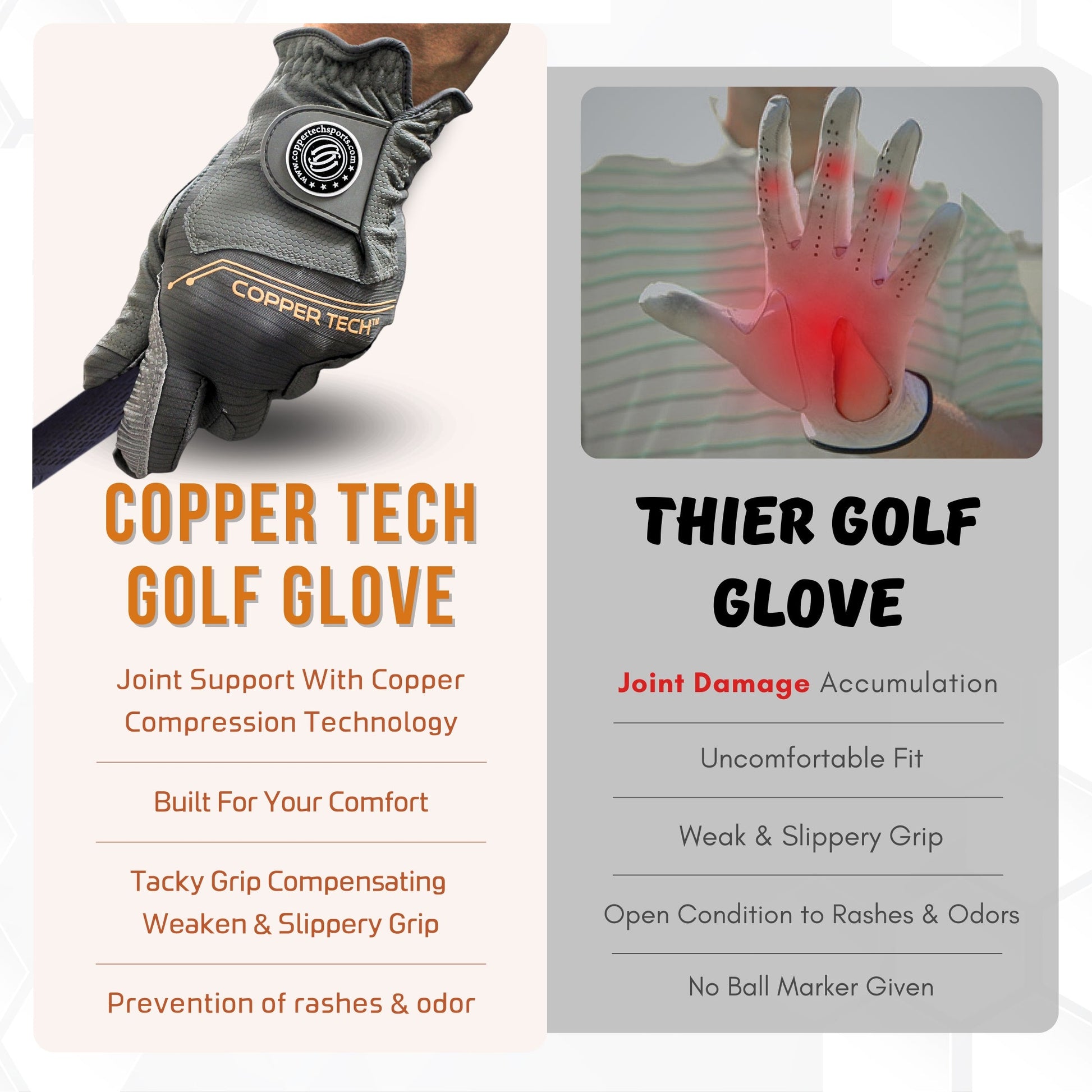 Copper Tech gloves use copper-infused fabric to support joint stiffness, improve grip, and keep hands dry. With a 4-way stretch and Spider Tacky palm, you get flexibility, breathability, and reliable hold for every swing. Free magnetic ball marker included!